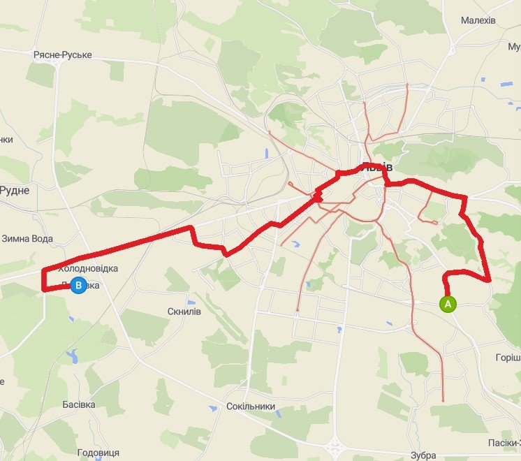Відстань 23 км, час їзди – біля 40 хв.