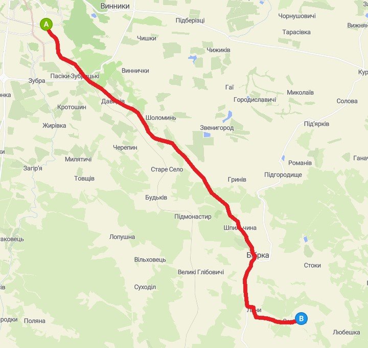 Відстань 37 км, час їзди – біля 2 год.