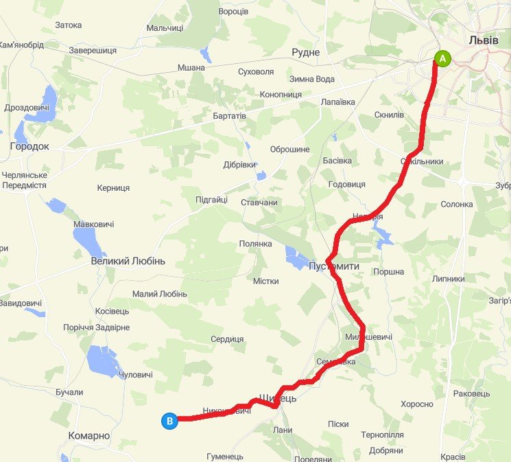 Відстань 36,6 км, час їзди – біля 68 хв.