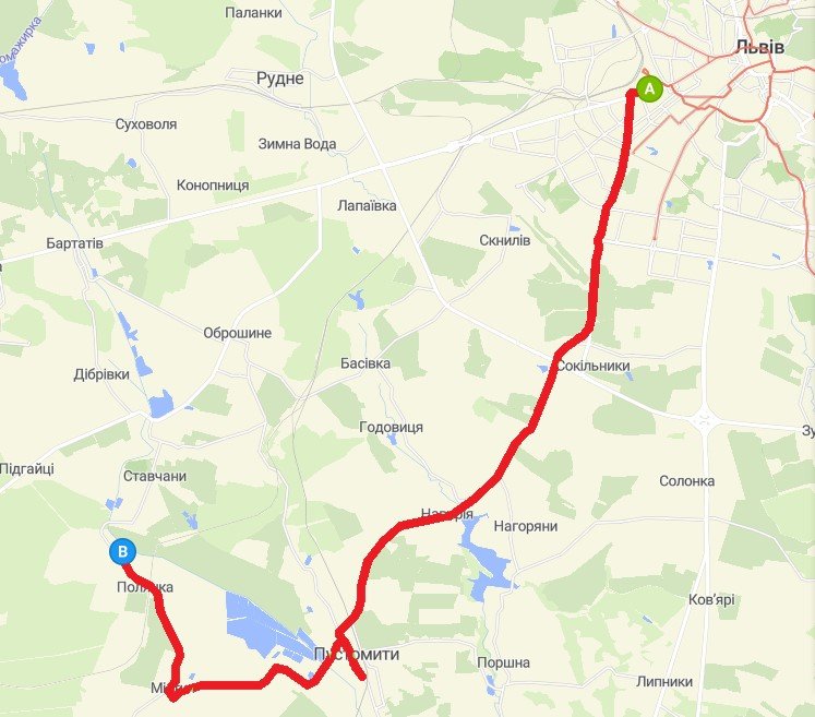 Відстань 26,8 км, час їзди – біля 47 хв.