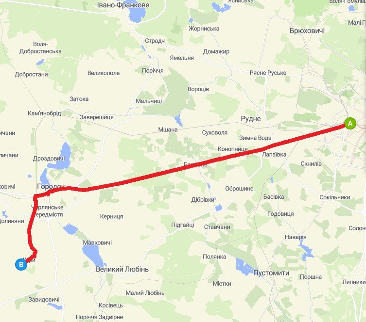 Відстань 35,3 км, час їзди – біля 85 хв.